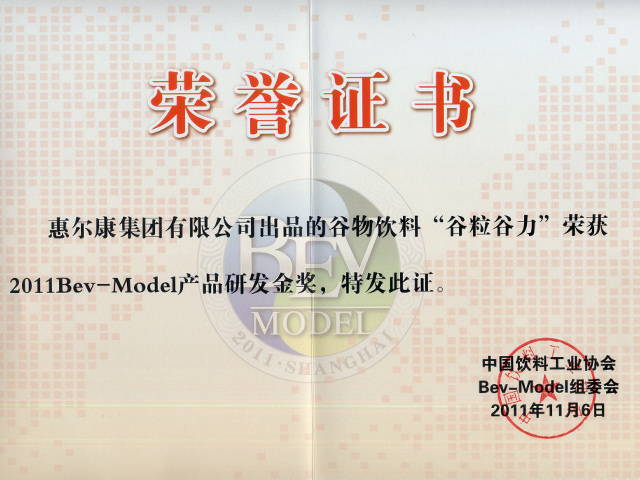中國(guó)飲料工業(yè)協(xié)會(huì)授予谷粒谷力2011Bev-Model產(chǎn)品研發(fā)金獎(jiǎng)