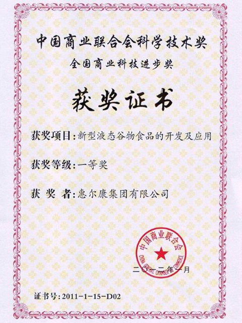 中國(guó)商業(yè)聯(lián)合會(huì)頒發(fā)中國(guó)商業(yè)聯(lián)合會(huì)科學(xué)技術(shù)獎(jiǎng)-全國(guó)商業(yè)科技進(jìn)步獎(jiǎng)一等獎(jiǎng)(新型液體谷物食品的開(kāi)發(fā)及應(yīng)用)